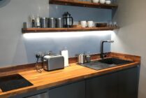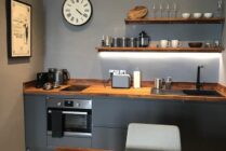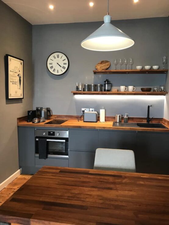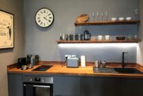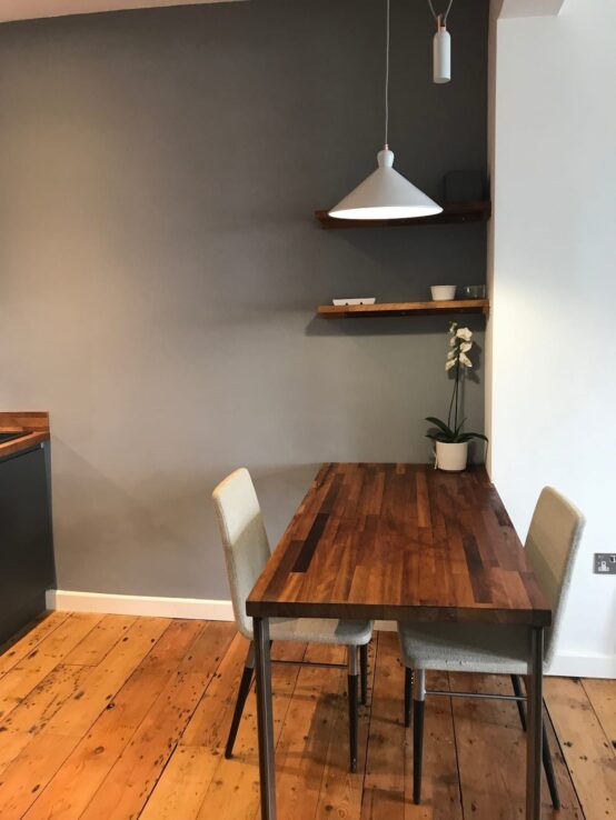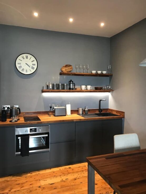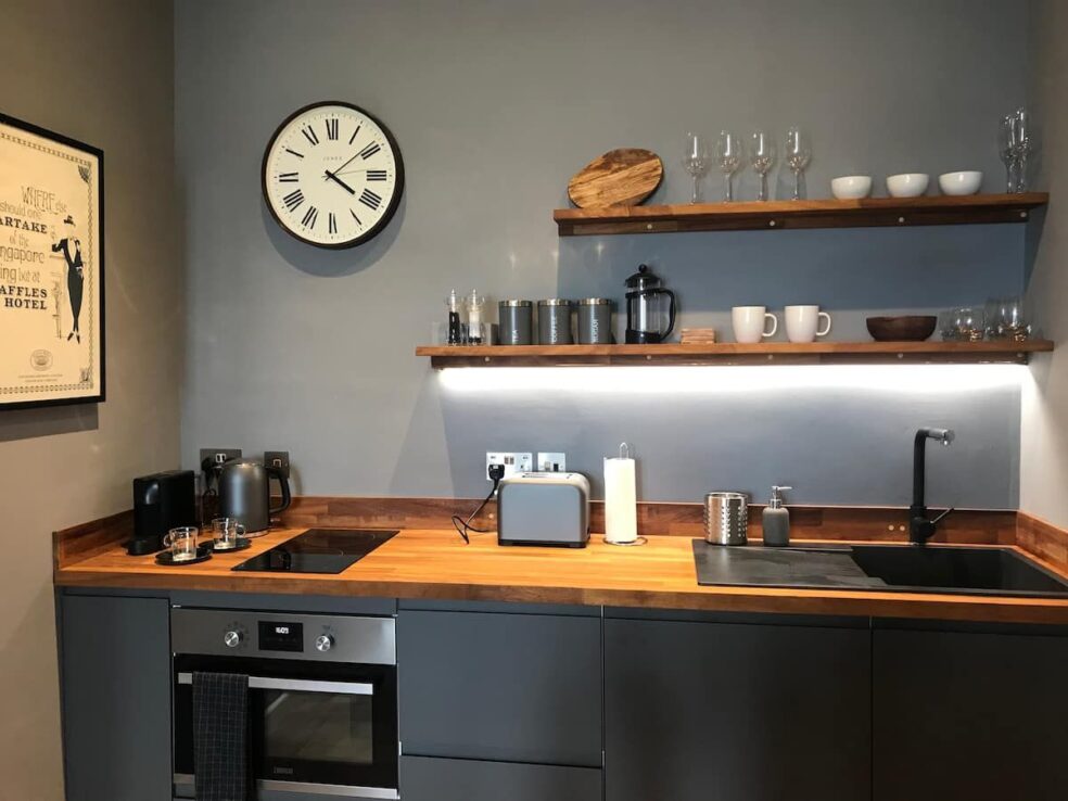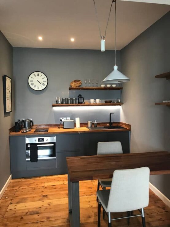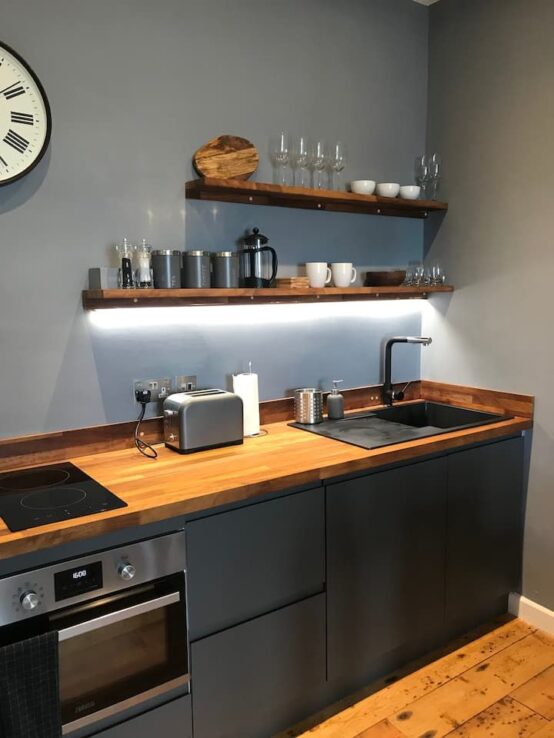 The fully equipped kitchen has everything you need for your stay; a two-ring hob, oven, kettle, fridge and toaster. There’s also a beautiful table which is perfect for dining or working on.